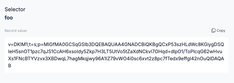 This is going to be part of the DNS text record name you create. For example, if you wanted to use the selector foo for the domain example.com, the final result will be foo._domainkey.example.com in DNS. This means you are going to create a TEXT record named foo._domainkey in the example.com DNS records. The value of that record will be something that looks like this: