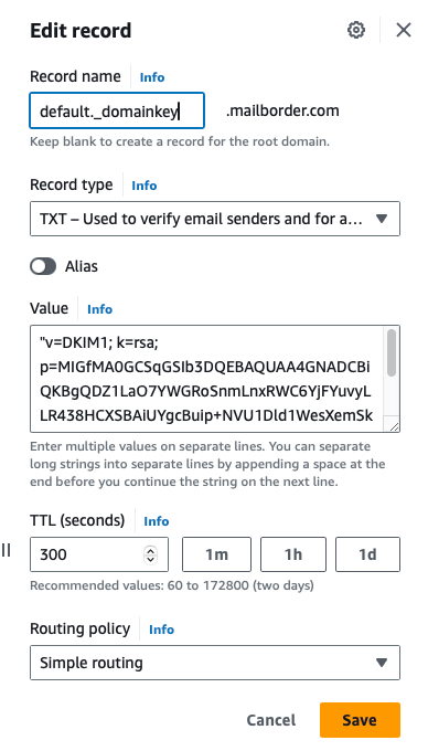 Once you have created your DKIM keys, go to where your DNS is hosted and create a new DNS text record. Again, the name of the record will be your selector name appended with ._domainkey at the end. The text value of the DNS record will be the output that starts with v=DKIM1; from the Mailborder generator or Easy DMARC. Below is a sample screenshot for mailborder.com using DNS hosted by Amazon Web Services. The name of our selector is default but you may use anything you prefer.