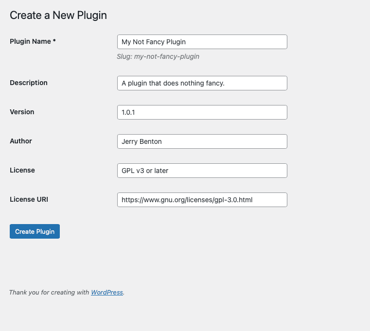 5. The plugin will be created, activated, and ready for development under /wp-content/plugins/{your-slug}/.