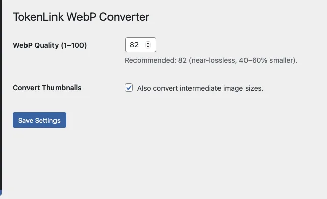 Opens Settings → TokenLink WebP to set image quality (default 82) and enable or disable thumbnail conversion.