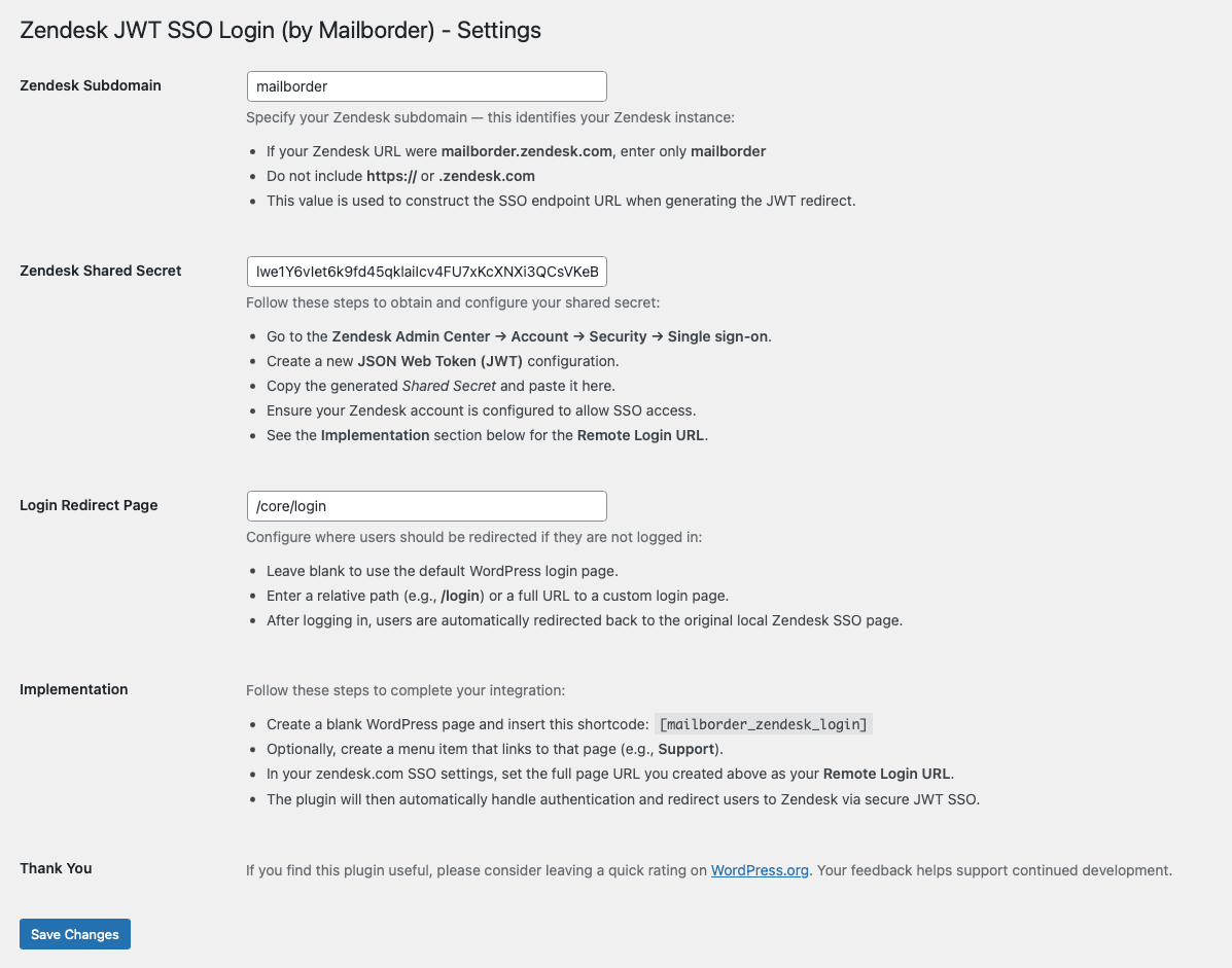 When a logged-in user clicks your Zendesk login link, WordPress generates a signed JWT token and securely redirects them to your Zendesk /access/jwt