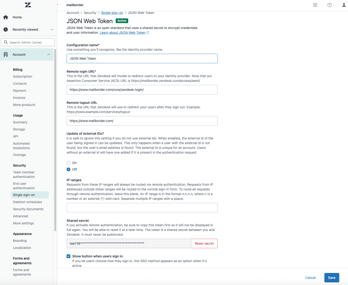 - In Zendesk, navigate to Admin Console → Account → Security → Single sign-on and create a new JSON Web Token (JWT) configuration.